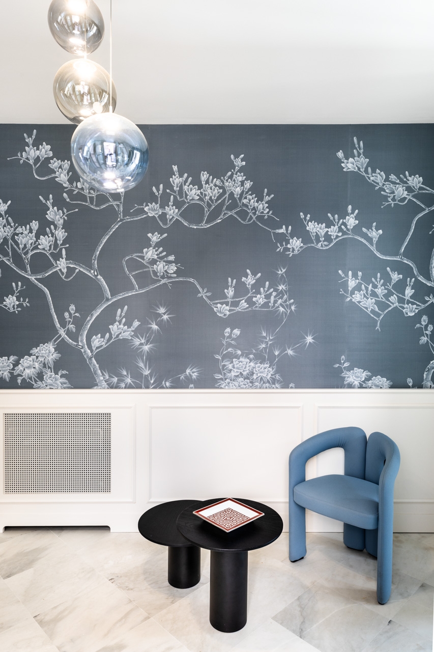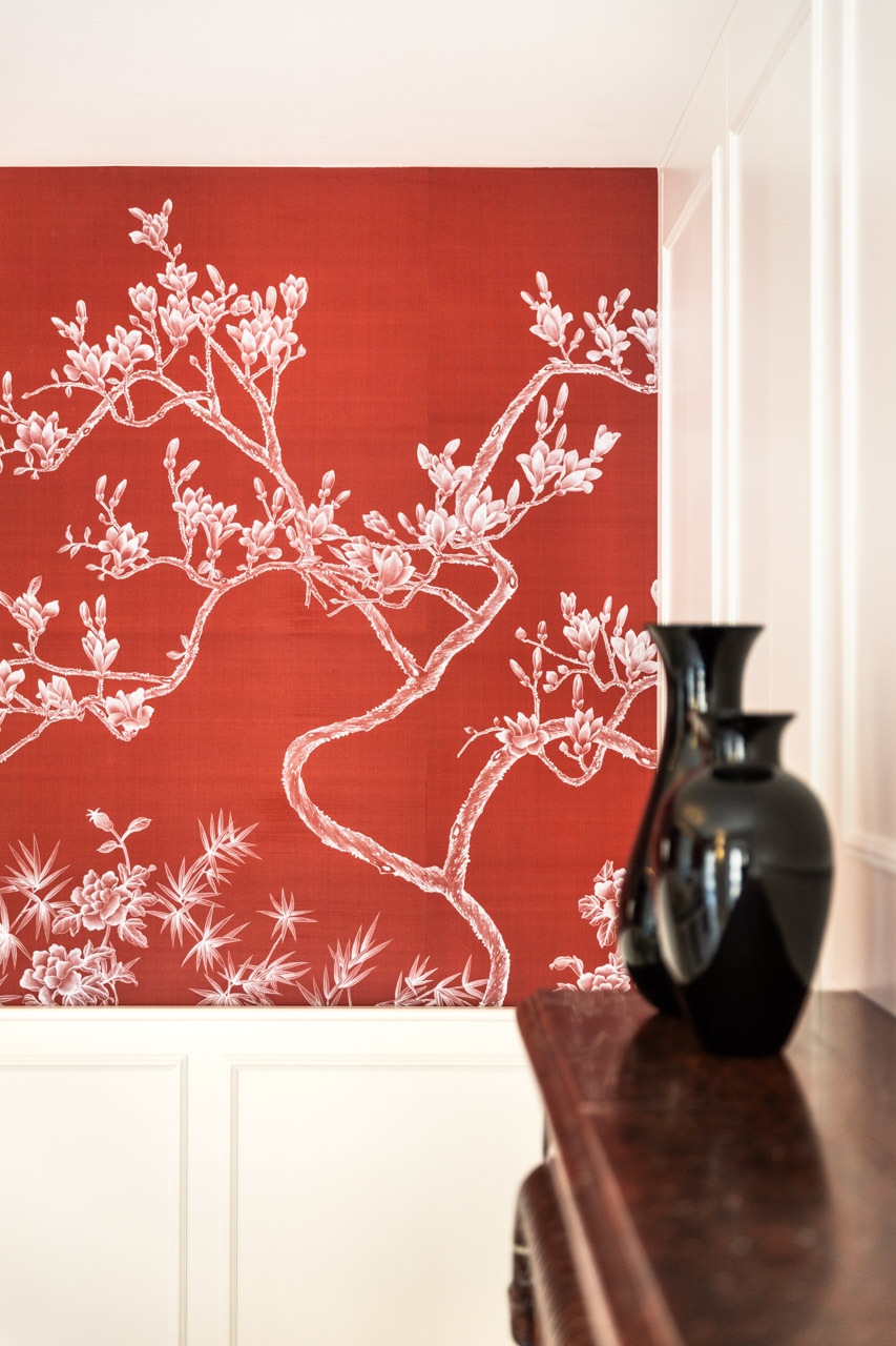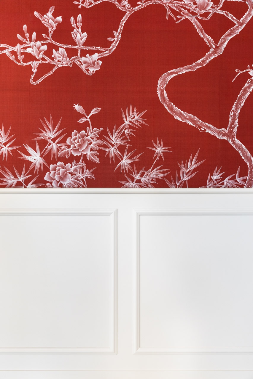 La nuova boiserie su disegno è la base per la carta da parati Misha Wall Coverings, realizzata con esclusivi tessuti in seta dipinti a mano, raffiguranti la magnolia giapponese, per un tocco di raffinata artigianalità.