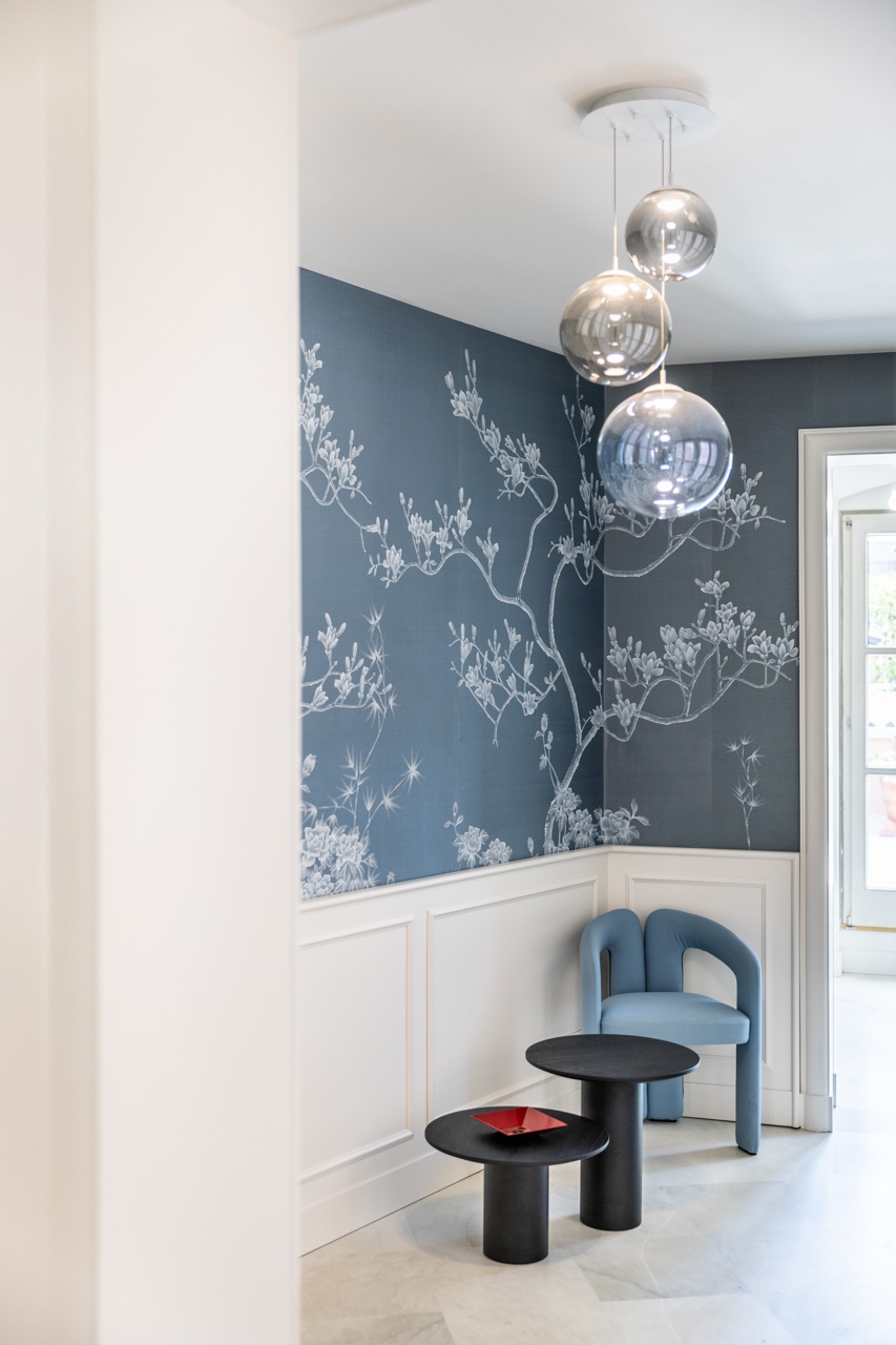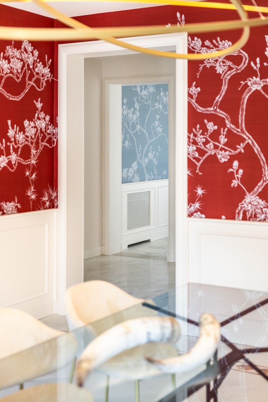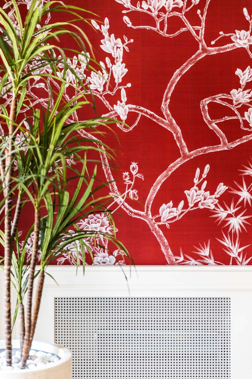 La nuova boiserie su disegno è la base per la carta da parati Misha Wall Coverings, realizzata con esclusivi tessuti in seta dipinti a mano, raffiguranti la magnolia giapponese, per un tocco di raffinata artigianalità.