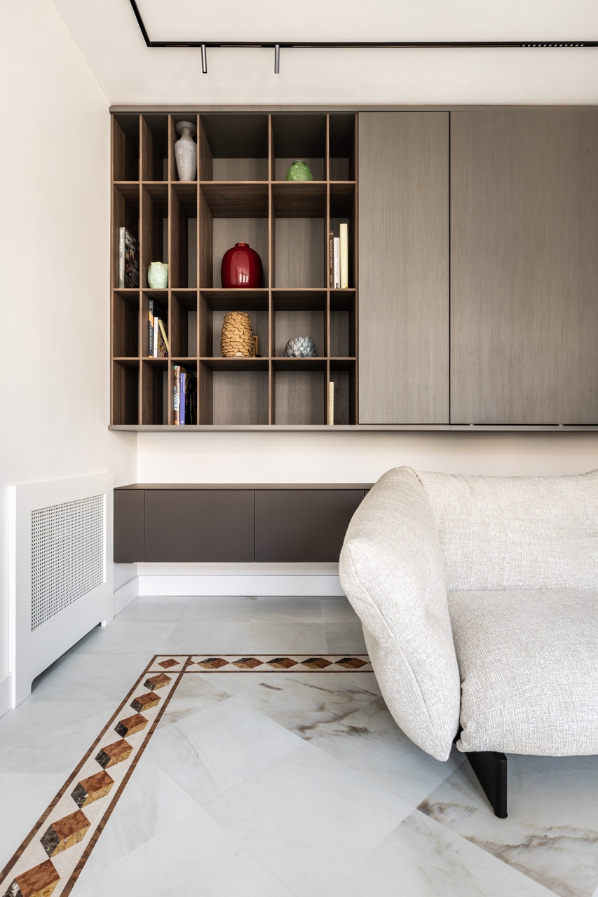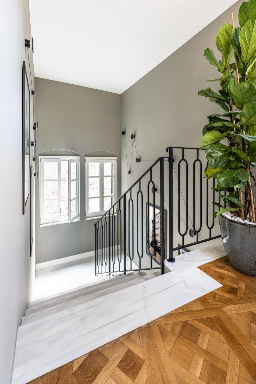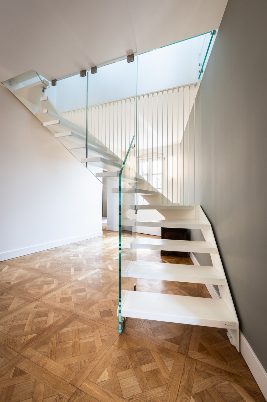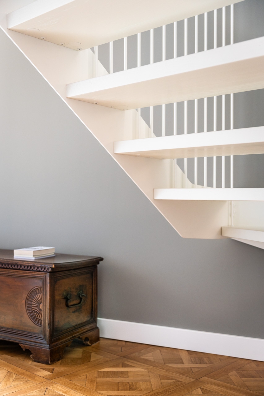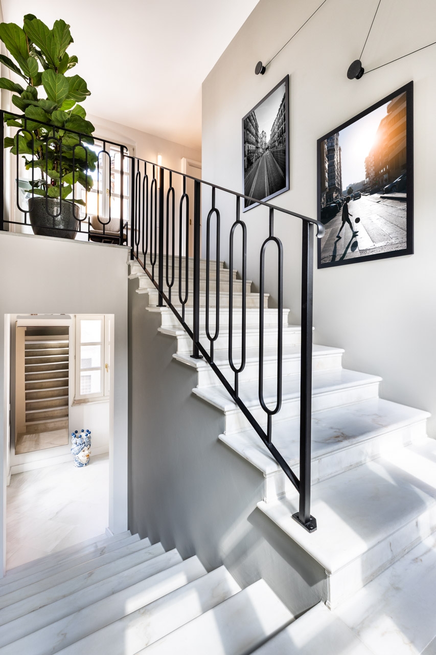 Ristrutturazione che valorizza la pavimentazione esistente in pregiato marmo, preservandone l’eleganza e il carattere. Arredi e boiserie sono stati progettati su misura, così come la ringhiera della scala in marmo e la nuova scala che conduce all’altana, pensata per conferire leggerezza e armonia agli spazi.