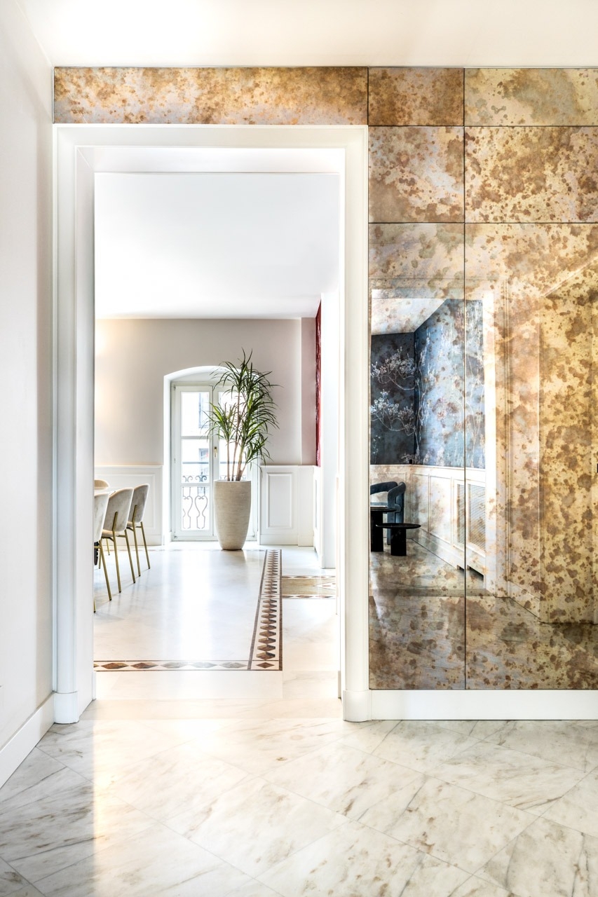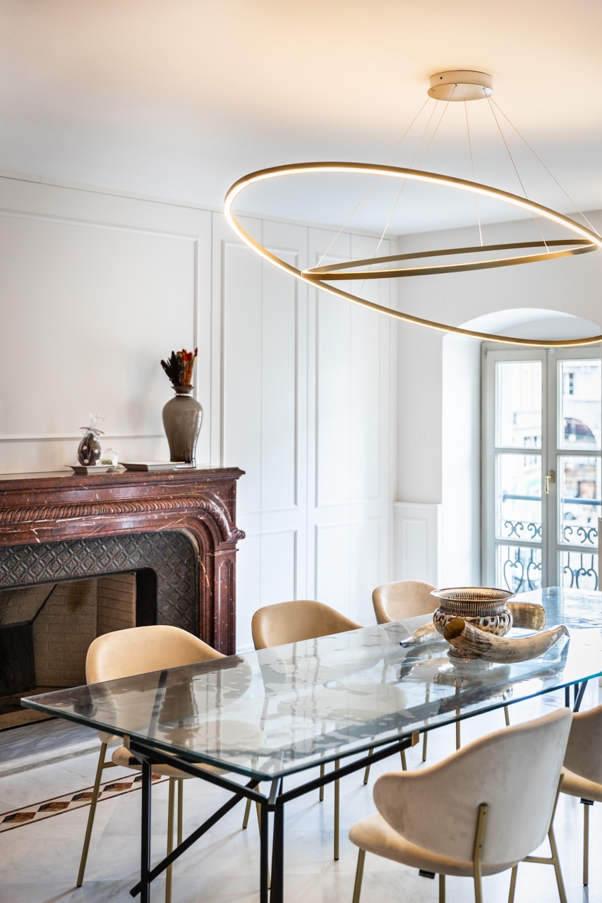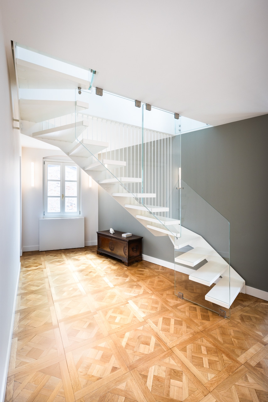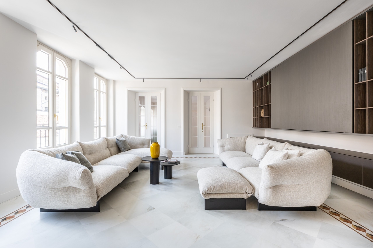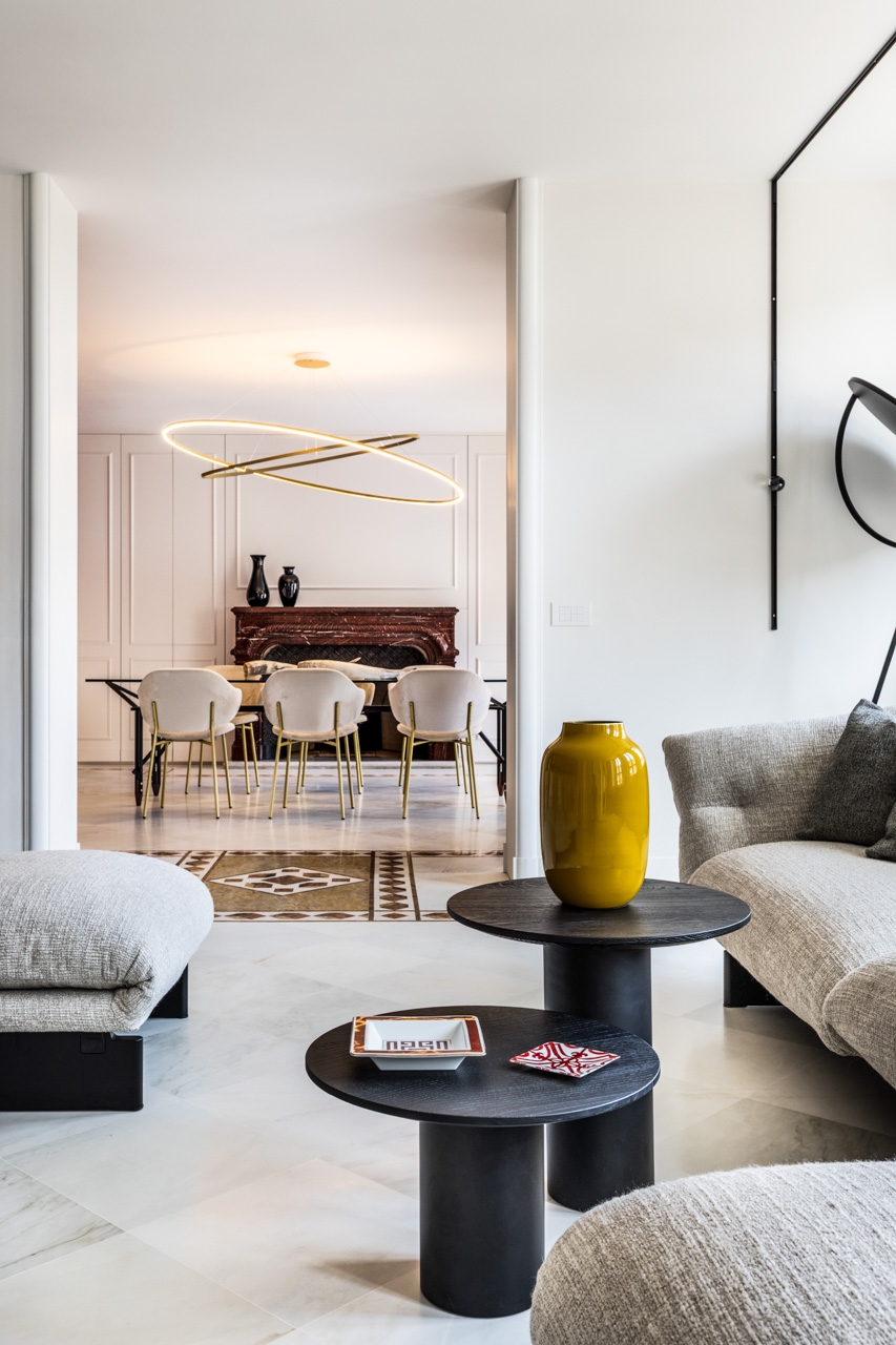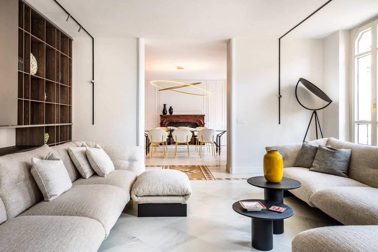 Ristrutturazione che valorizza la pavimentazione esistente in pregiato marmo, preservandone l’eleganza e il carattere. Arredi e boiserie sono stati progettati su misura, così come la ringhiera della scala in marmo e la nuova scala che conduce all’altana, pensata per conferire leggerezza e armonia agli spazi.