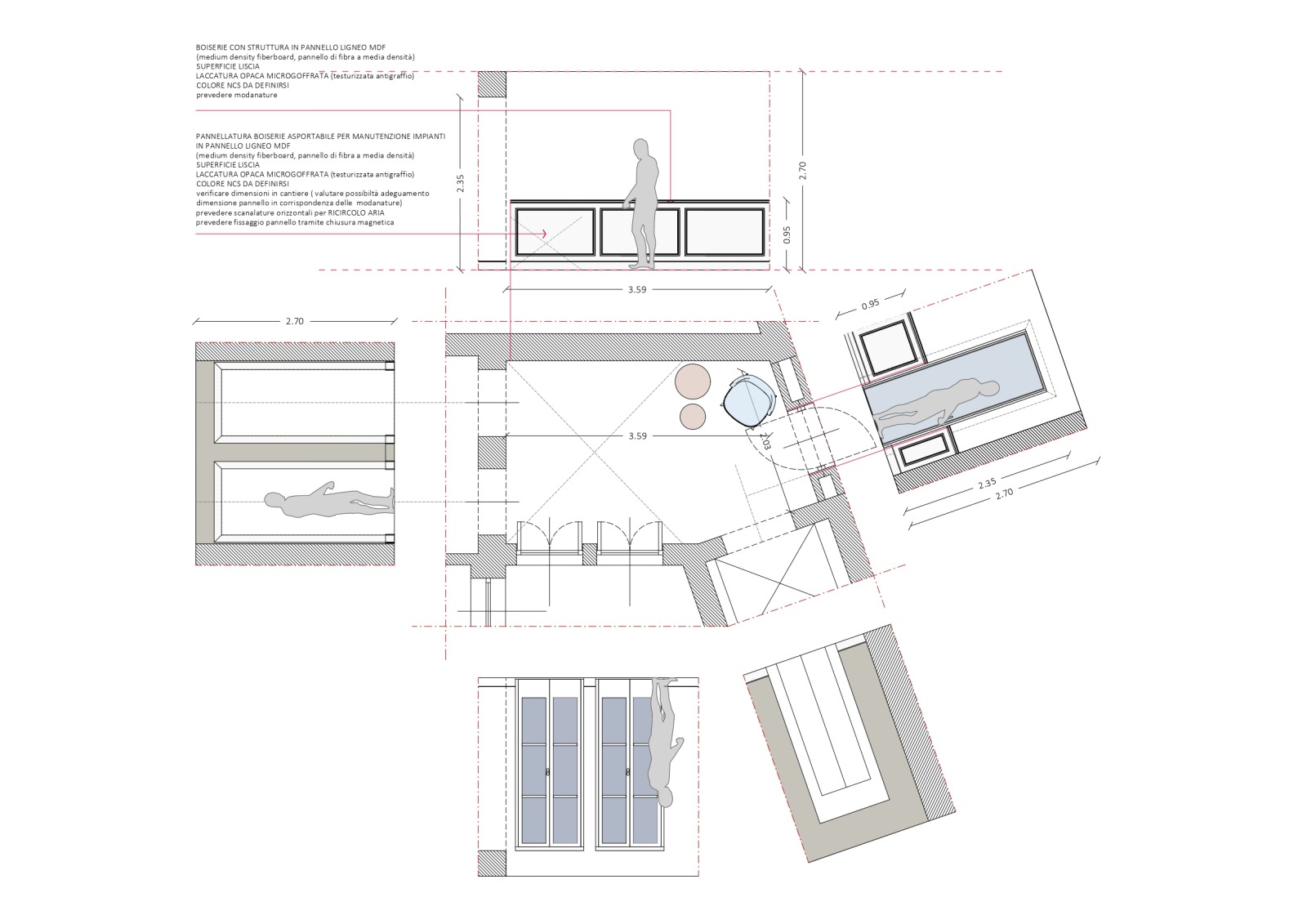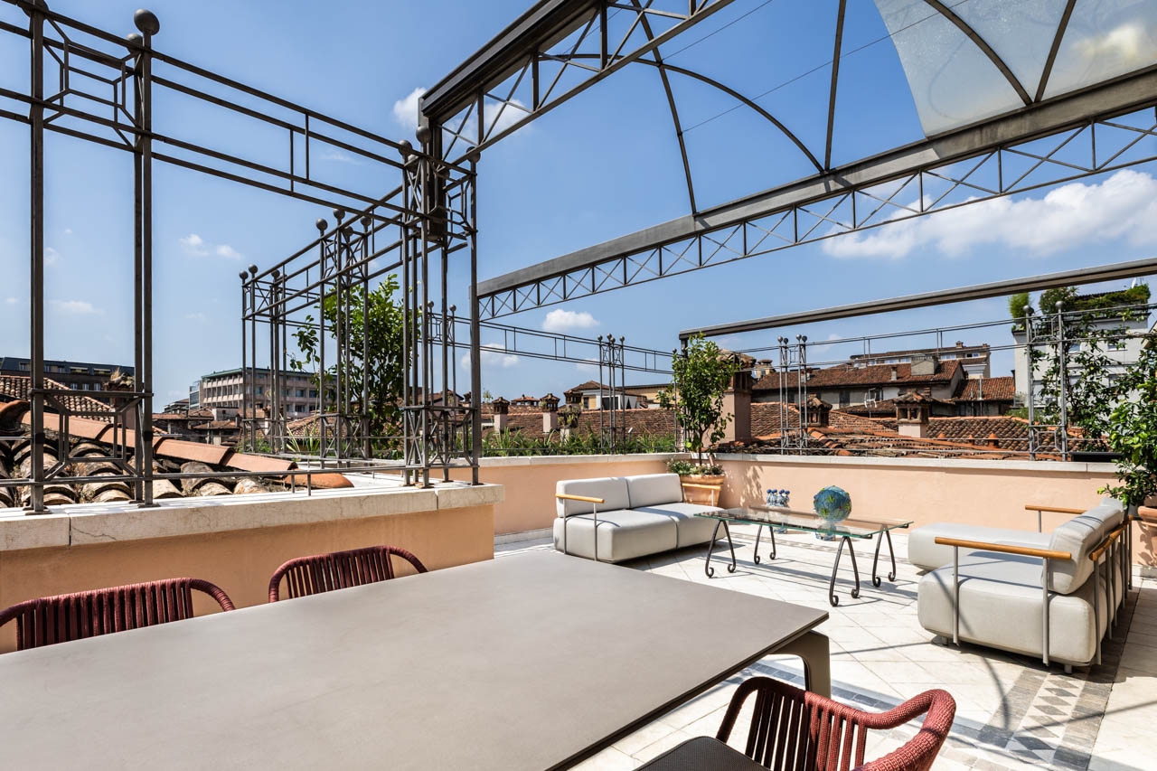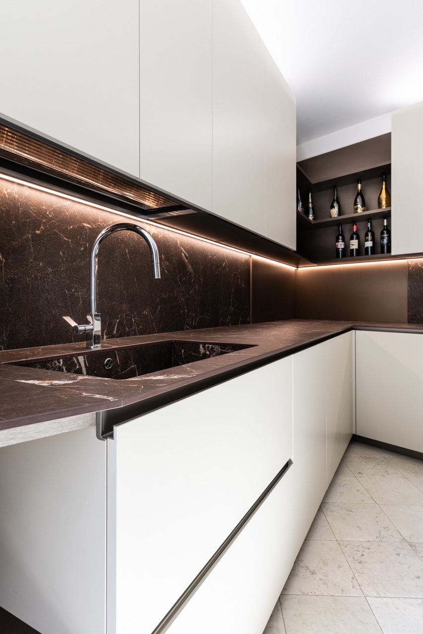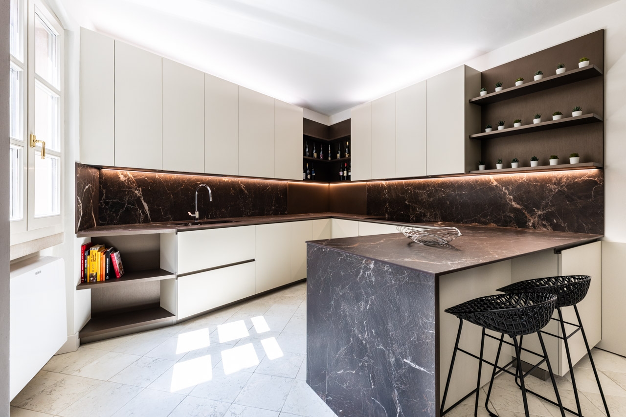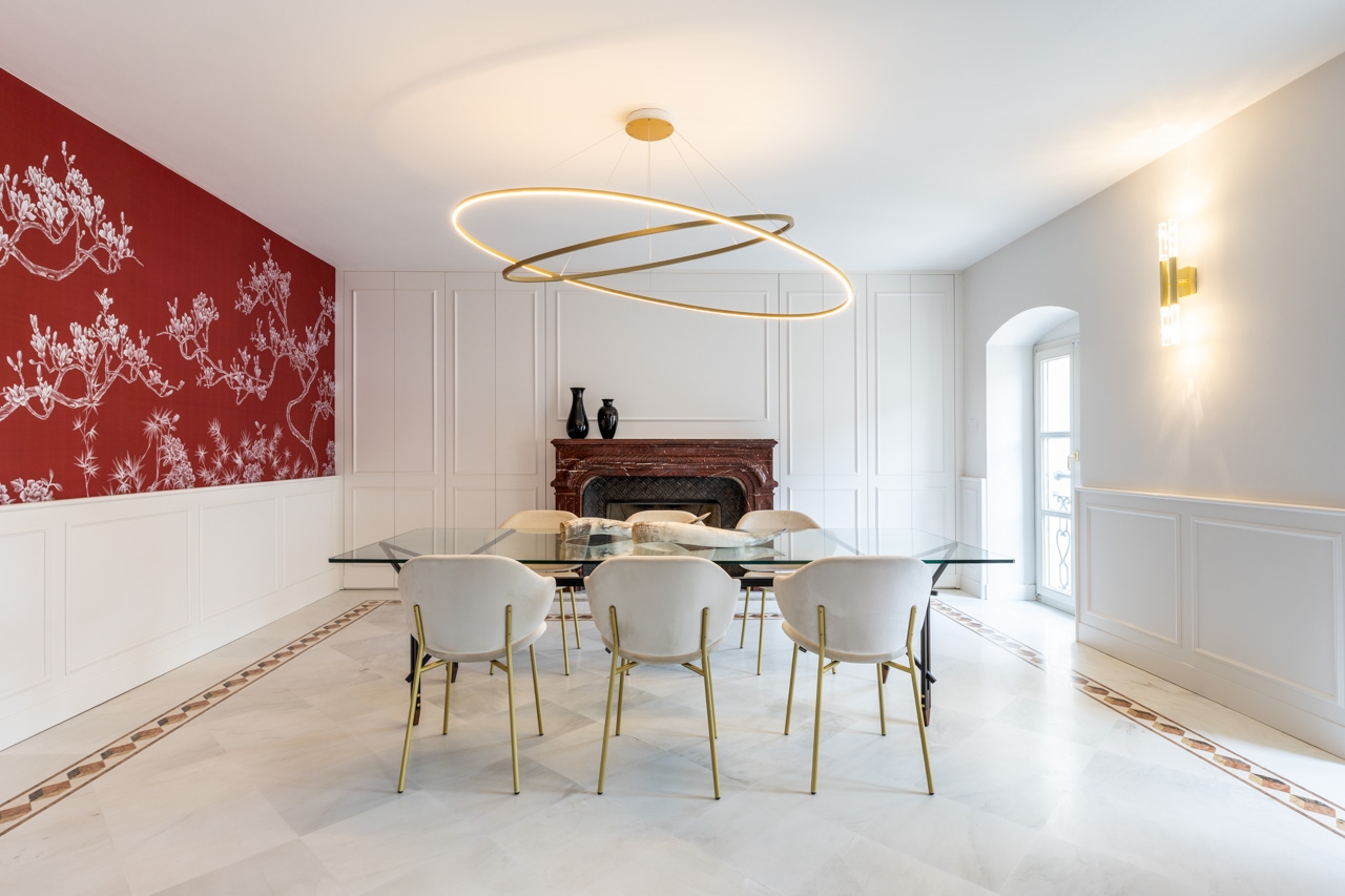 Ristrutturazione che valorizza la pavimentazione esistente in pregiato marmo, preservandone l’eleganza e il carattere. Arredi e boiserie sono stati progettati su misura, così come la ringhiera della scala in marmo e la nuova scala che conduce all’altana, pensata per conferire leggerezza e armonia agli spazi.