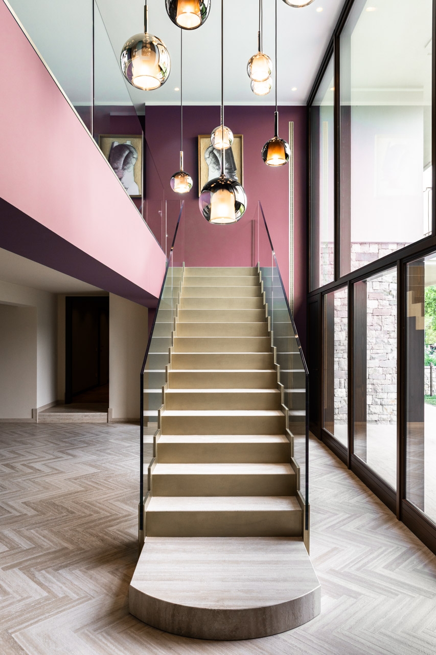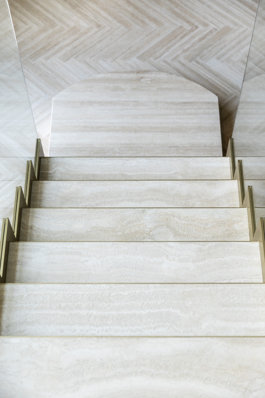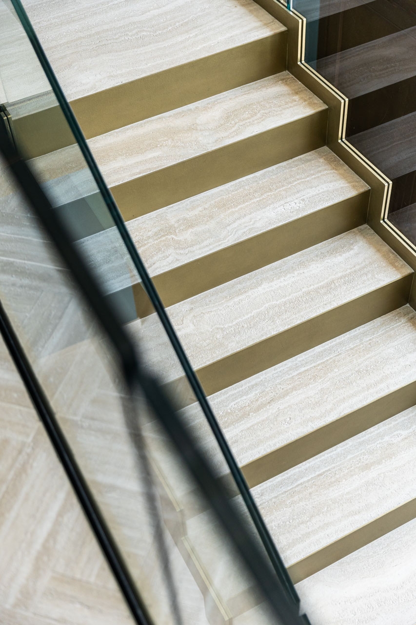 Lo studio di architettura ha curato lo studio, la progettazione e la realizzazione di una scenografica scala interna per una villa privata, combinando eleganza formale e precisione tecnica. Interamente realizzata in pietra travertino, la scala si distingue per la pulizia delle linee e la continuità materica, valorizzata dall’inserimento di paratie laterali in cristallo trasparente che ne esaltano la leggerezza visiva e il dialogo con lo spazio circostante. Il progetto rappresenta un perfetto equilibrio tra solidità strutturale e raffinatezza contemporanea.